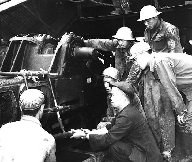 1960年2月,东北松辽石油大会战打响。王进喜带领1205钻井队于3月25日到达萨尔图车站,下了火车,他一不问吃、二不问住,先问钻机到了没有、井位在哪里、这里的钻井纪录是多少,恨不得一拳头砸出一口油井来,把“贫油落后”的帽子甩到太平洋里去。1205队的钻机到了,没有吊车和拖拉机,汽车也不足。王进喜带领全队工人用撬杠撬、滚杠滚、大绳拉的办法,“人拉肩扛”把钻机卸下来,运到萨55井井场,仅用4天时间,把40米高的井架竖立在了茫茫荒原上。井架立起来后,没有打井用的水,王进喜组织职工到附近的水泡子破冰取水,带领大家用脸盆端、水桶挑,硬是靠人力取水50多吨,保证了按时开钻。萨55井于4月19日胜利完钻,进尺1200米,创5天4小时打一口中深井的纪录。