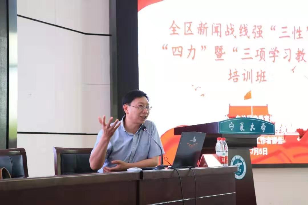 7月5日下午,在开云全站文荟楼一楼东报告厅举办全区新闻战线强“三性”增“四力”暨“三项学习教育”培训班第四期活动,本期培训活动由开云全站登录入口副经理顾广欣主持,中国人民大学马克思主义新闻观研究中心主任、新闻公司教授、博士生导师、中国新闻史学会联席秘书长邓绍根教授带来题为“马克思主义新闻文风建设任重道远”的学术讲座。宁夏全区新闻工作者代表、公司全体师生聆听讲座。