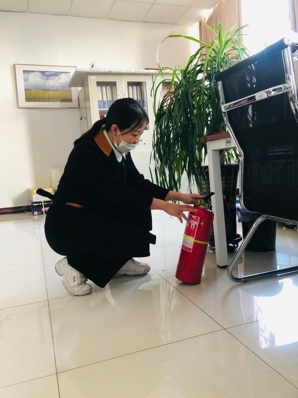 教师办公室中,多位教师集中学习消防安全知识及自救逃生技能,以助老师提高安全防范和防火自救能力,并有教师现场示范讲解灭火器的使用方法和注意事项。