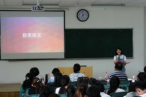 2013级新闻学专业杨慧同学作为获奖员工代表发表获奖感言。她谈到,在参赛的过程中,有艰辛也有快乐,更重要的是通过这次比赛成长了许多,收获了许多,同时也希望在座的同学珍惜传播文化艺术节的平台,积极参与到活动中,争取优秀的成绩。