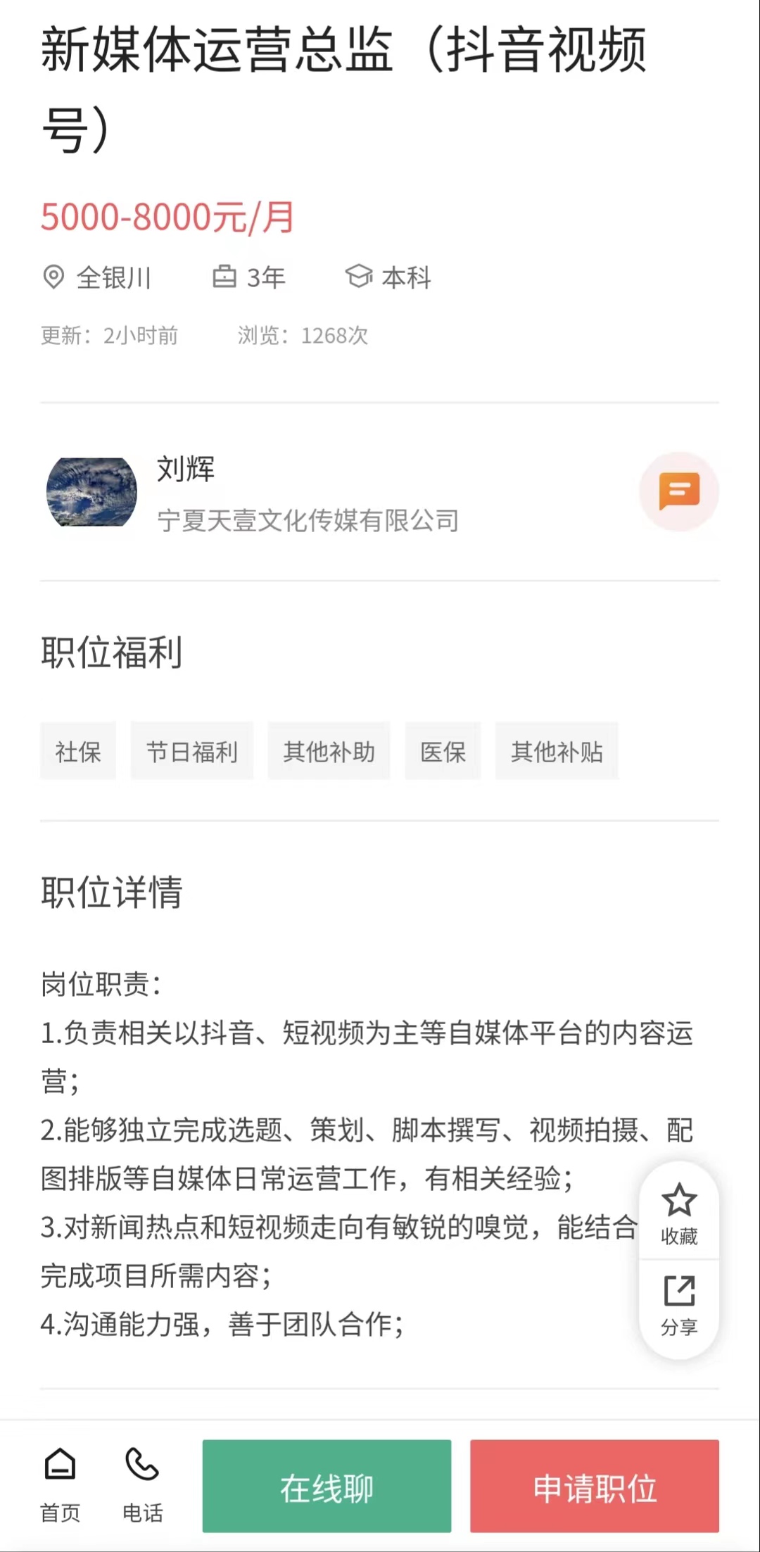 岗位:新媒体运营总监(抖音视频号)