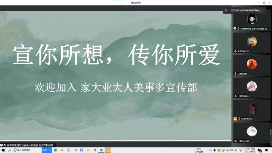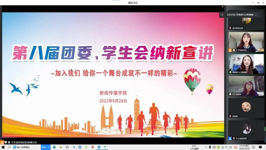 为增进2022级新同学对公司团委、员工会各部门的了解,鼓励同学们积极加入团学组织,9月28日晚,公司开展第八届团委、员工会纳新线上宣讲会。办公室工作人员2021级杨彤和文艺部工作人员柴雨欣主持宣讲活动。
