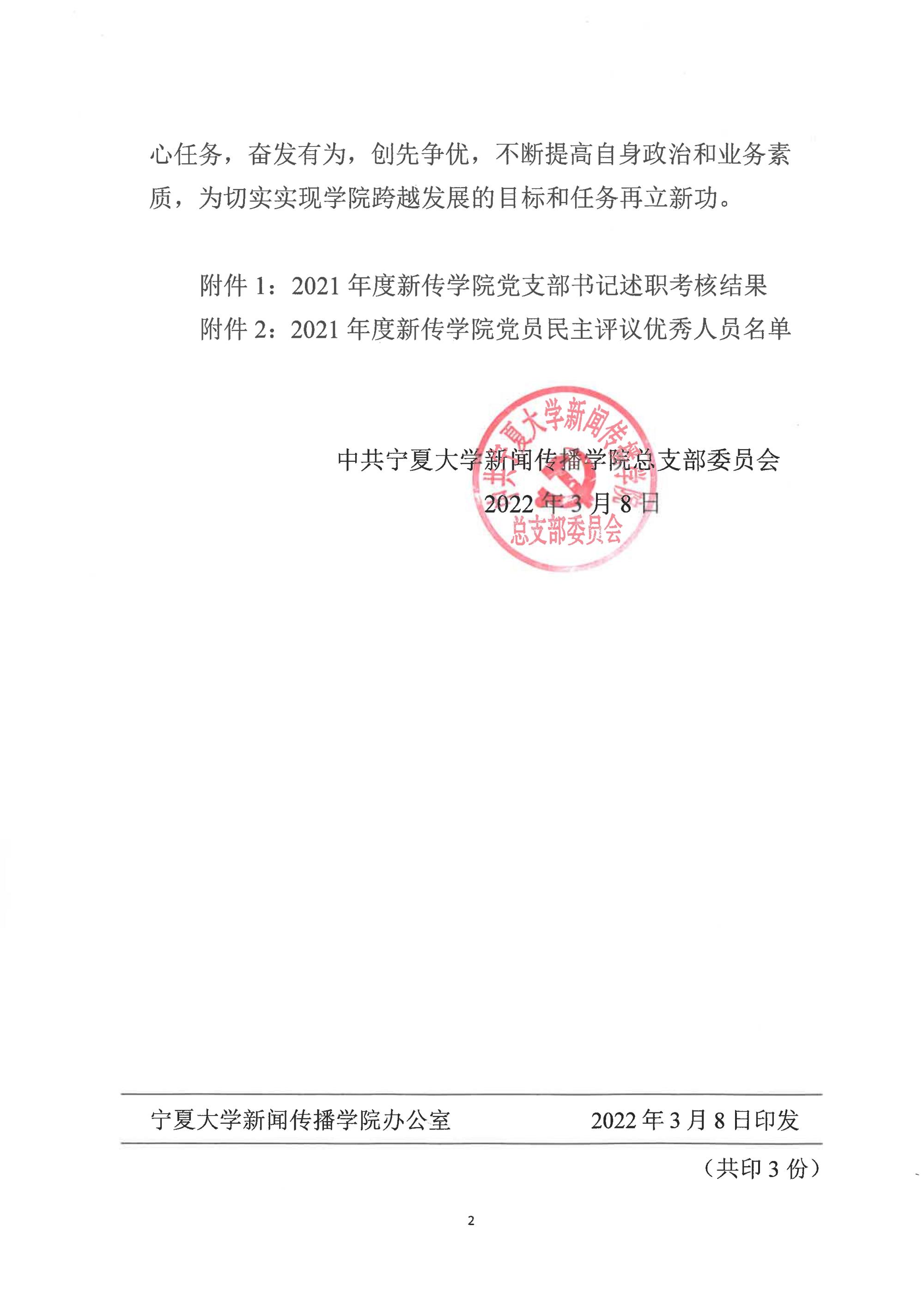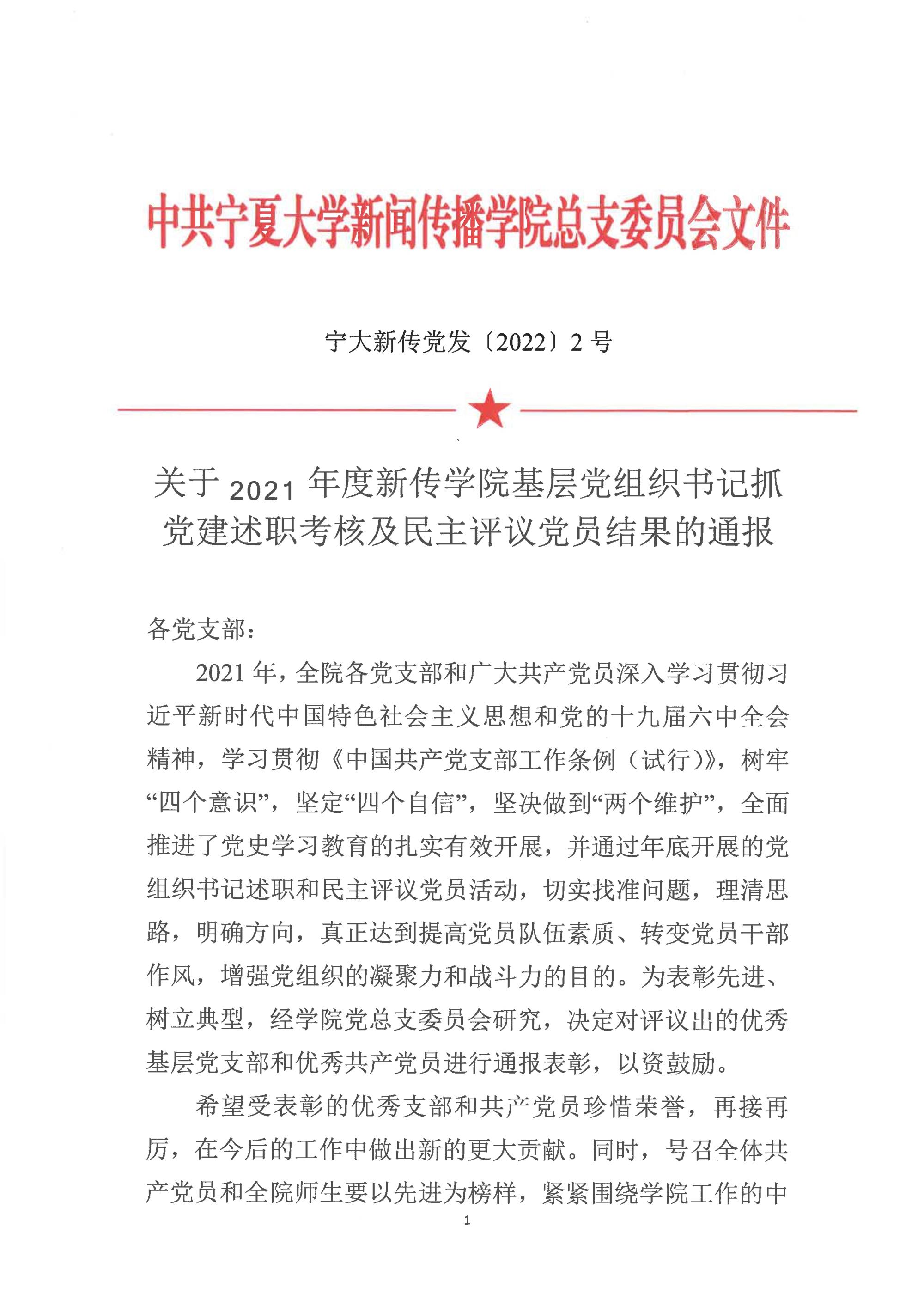 宁大新传党发〔2022〕2号 关于2021年度新传公司基层党组织书记抓党建述职考核及民主评议党员结果的通报