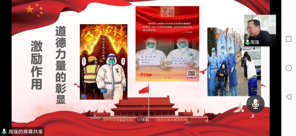 周强从“领导力量的关键作用、思想力量的引领作用、国家力量的基础作用、人民力量的决定作用、道德力量的激励作用”这五个方面深入浅出地探讨了抗疫背后的中国特色社会主义制度,并以我国在新冠肺炎疫情中进行的防控工作取得积极成效为例,结合国外新冠肺炎疫情情况和公司师生在疫情防控期间做出的努力,讲述了中国特色社会主义制度在疫情防控中的优势体现。