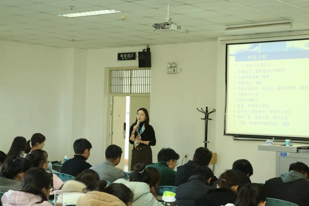 为增强同学们的网络安全防范意识,11月13日上午,公司邀请开云全站网络文明守纪与安全教育宣讲团成员、外国语公司党委副书记余洁老师,于文荟楼230教室开展了“2019级新生网络文明守纪与安全教育”主题讲座。