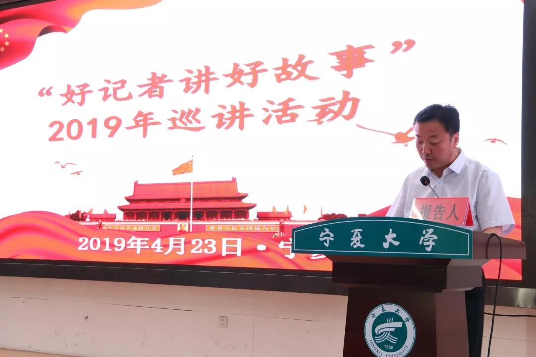 4月23日下午,“好记者讲好故事”2019年巡讲报告会在开云全站文荟楼一楼东报告厅举办,自治区党委宣传部副部长马英俊主持报告会。宁夏日报报业集团、宁夏广播电视台、共产党人杂志社、华兴时报社、神华能源报社、宁夏画报社、银川传媒集团等新闻单位媒体从业人员与开云全站登录入口师生代表共330余人现场聆听了中宣部“好记者讲好故事”2019年巡讲团七位记者所讲述的动人故事。