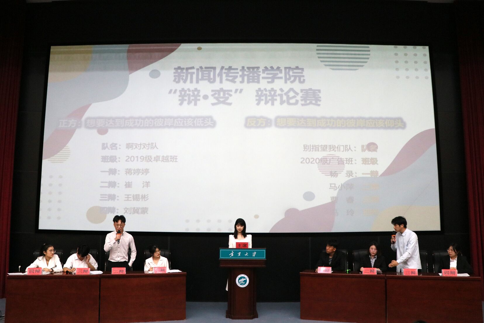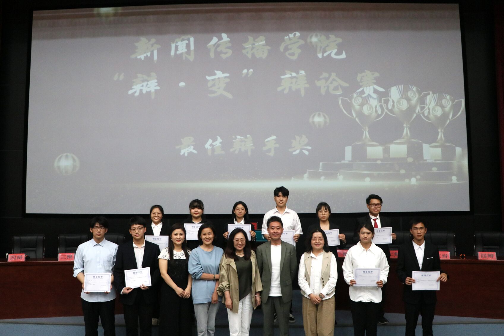 而辩手中也涌现出多位佼佼者。冯枢豪同学临危不乱,在自由辩论中巧舌如簧,风趣幽默,通过对比双方观点进一步为己方立论;张崇伟同学逻辑清晰,思维敏捷,精辟的措辞和犀利的言语燃爆全场;刘璐瑶同学机智干练,面对反方的提问面不改色沉着应对;张赵文硕同学对答如流,在步步紧逼中彰显逻辑奥妙;马帅同学稳健细致,从生活小事出发援疑质理,从容有度。总之,10支队伍的40位辩手用各具特色的优异表现彰显出新传学子敏捷的思维、顺畅的表达和高昂的青春风貌。