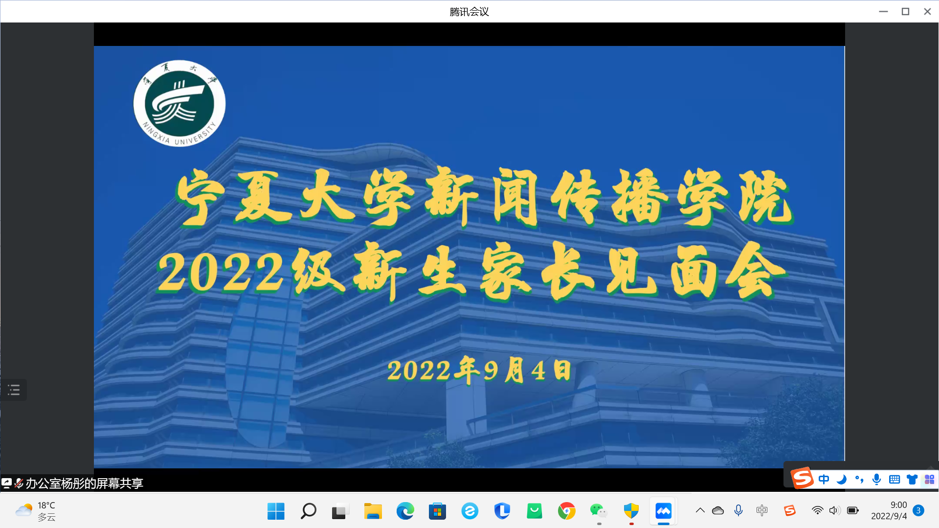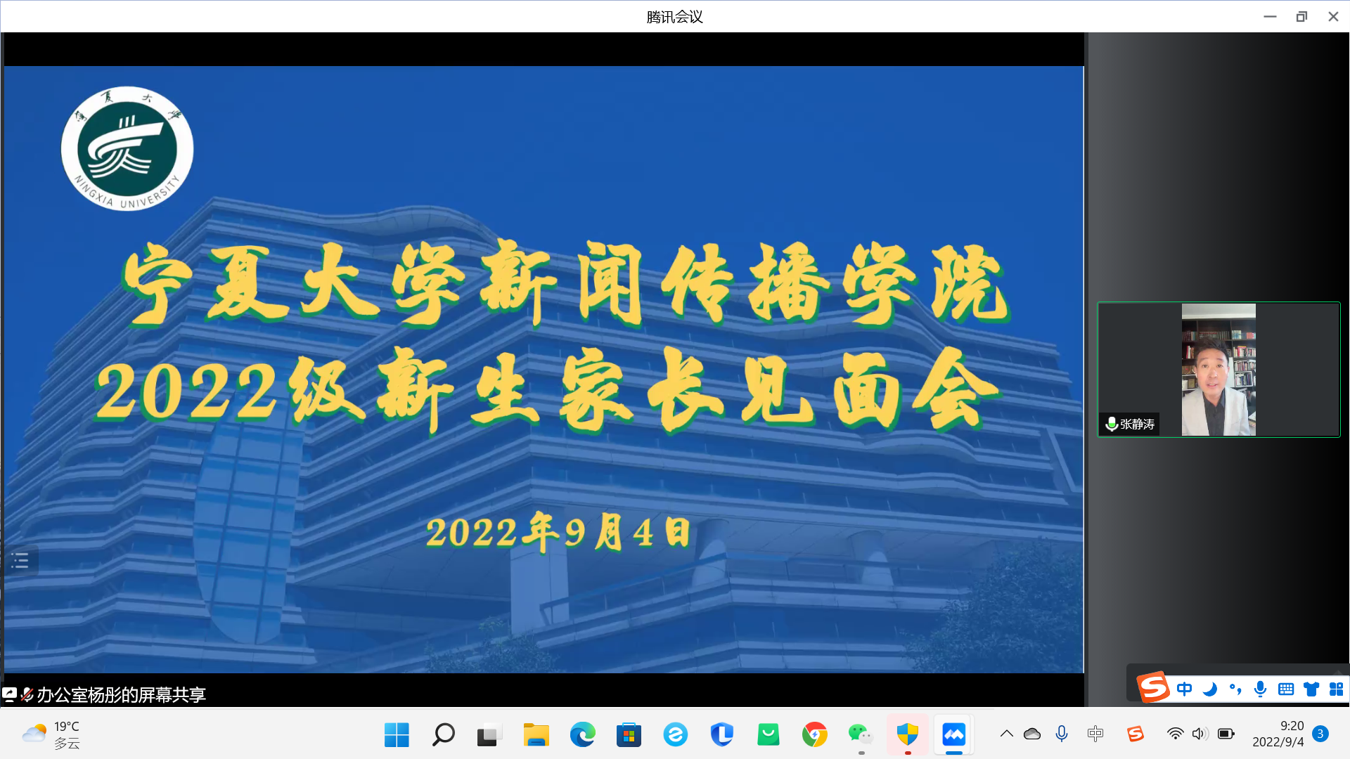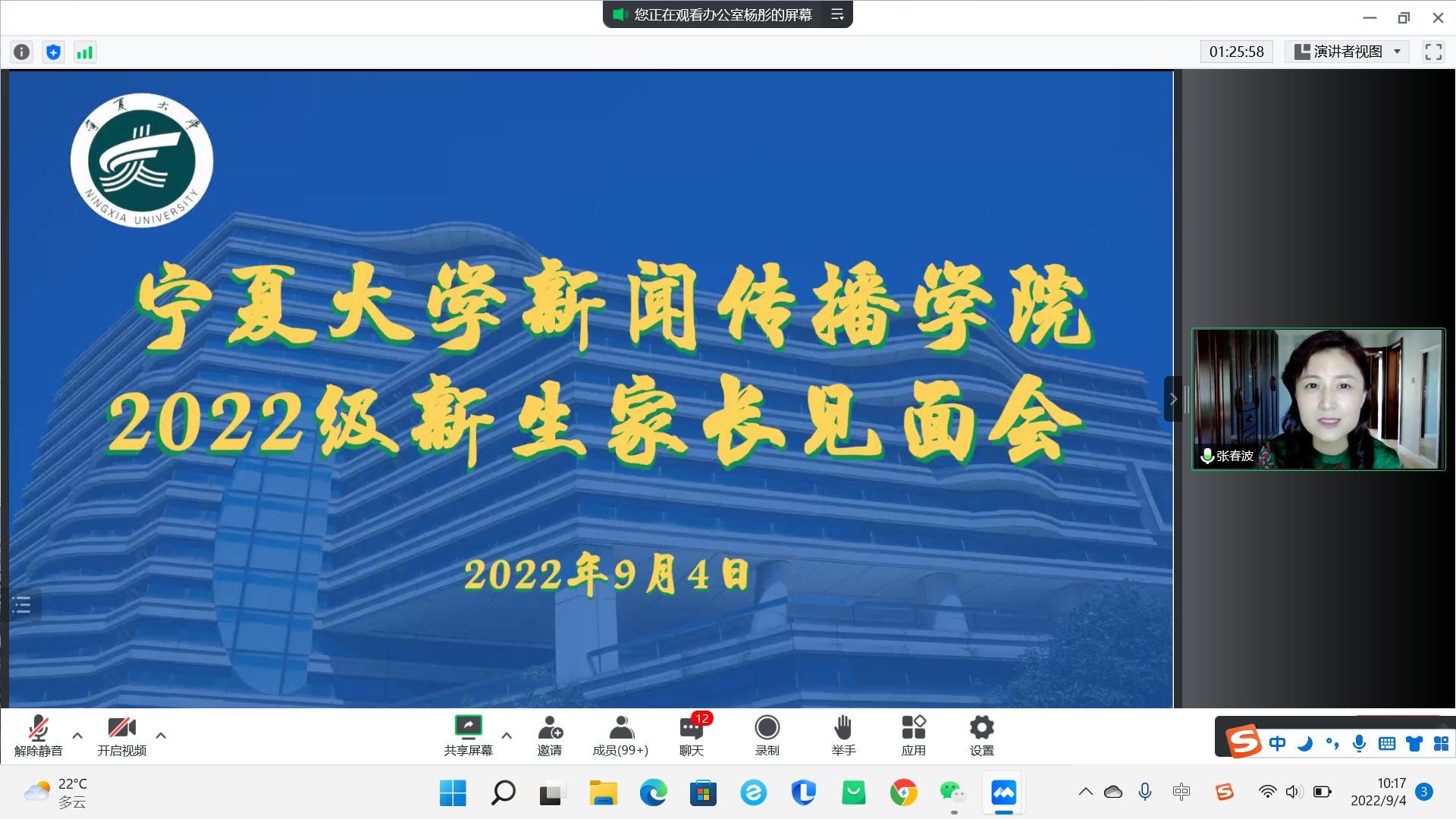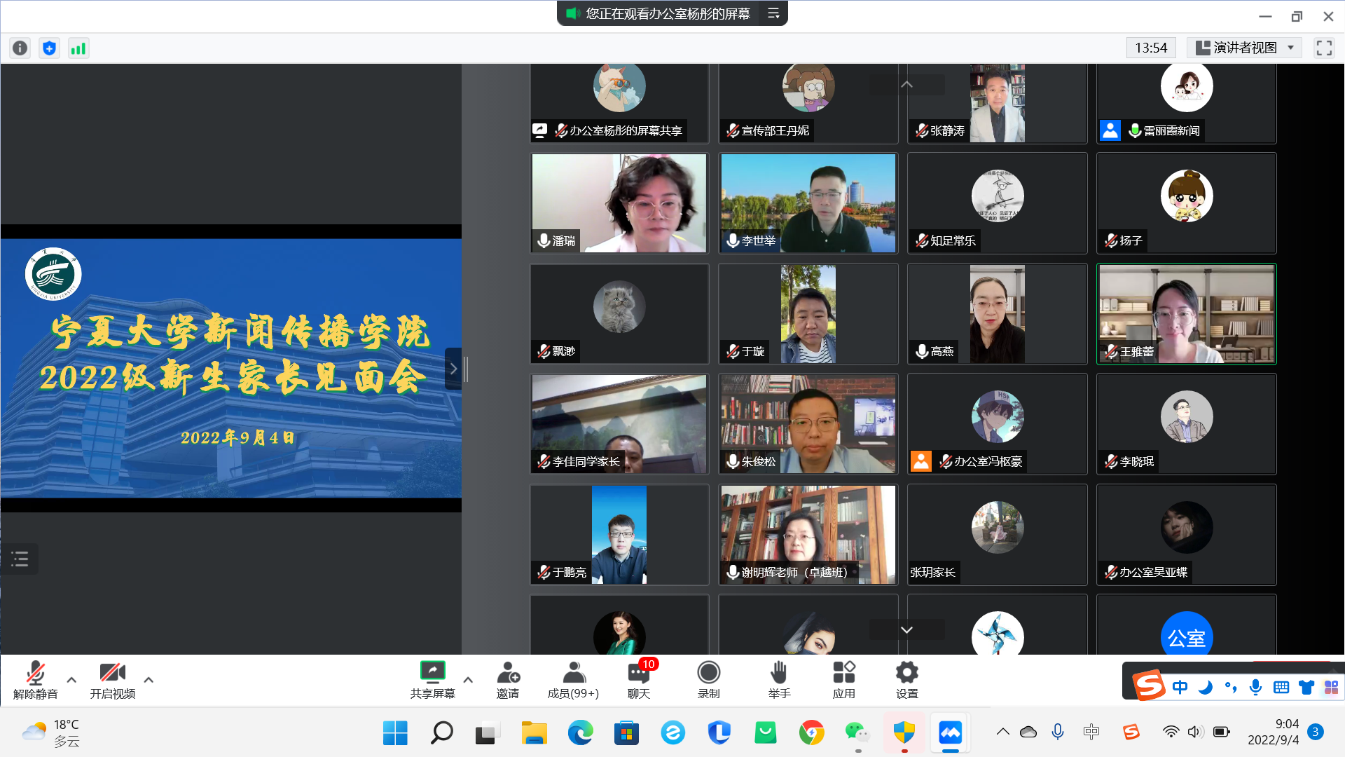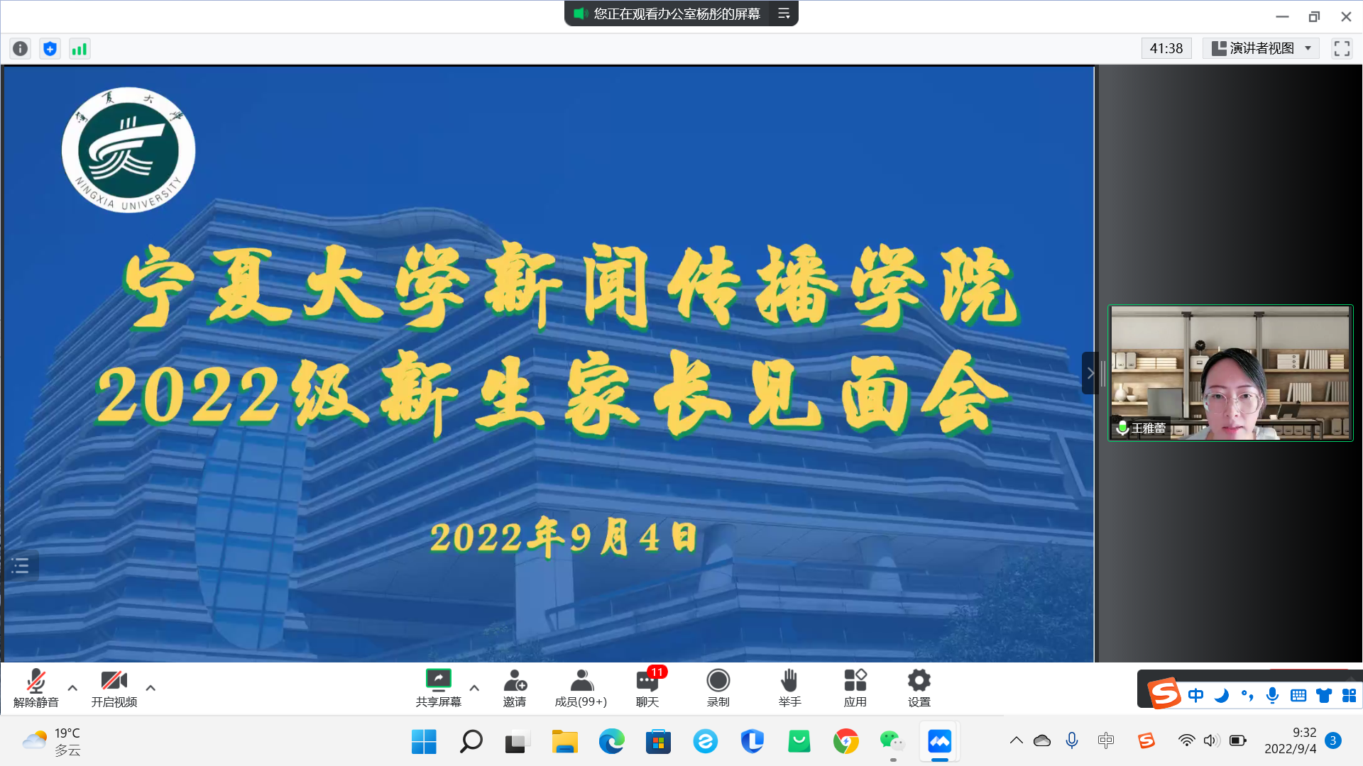 9月4日上午,公司于腾讯会议召开了2022级新生开学典礼及新生家长见面会,公司领导班子成员、系主任、新生班主任及2022级本科生、研究生及新生家长在云端参加了会议,会议由员工工作办公室主任雷丽霞主持。