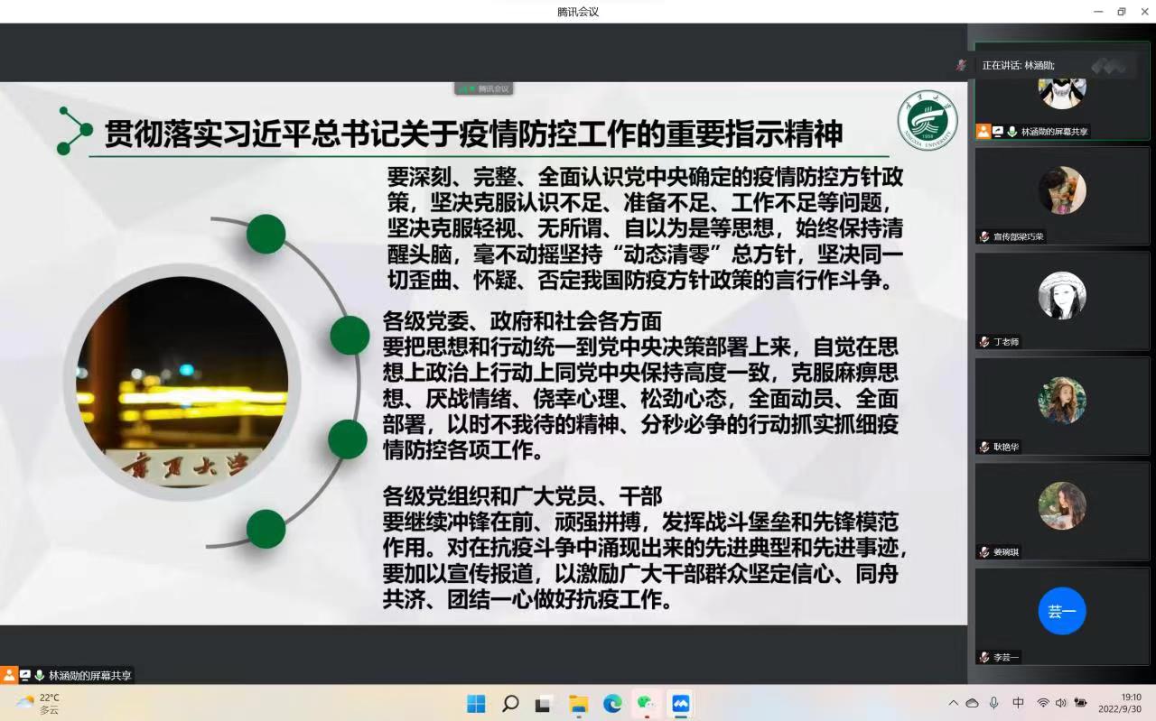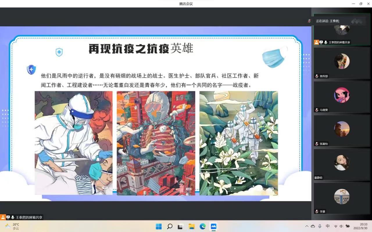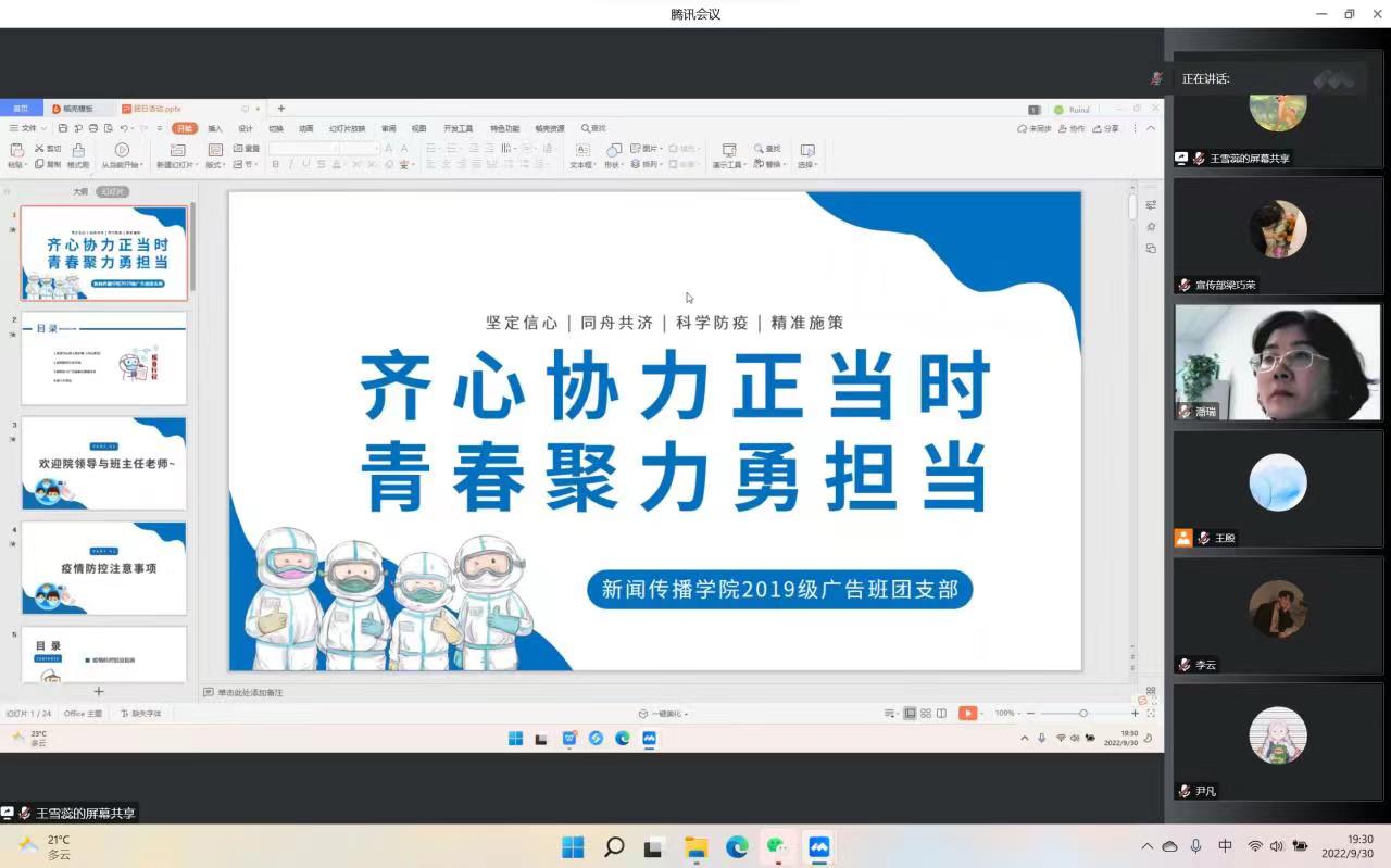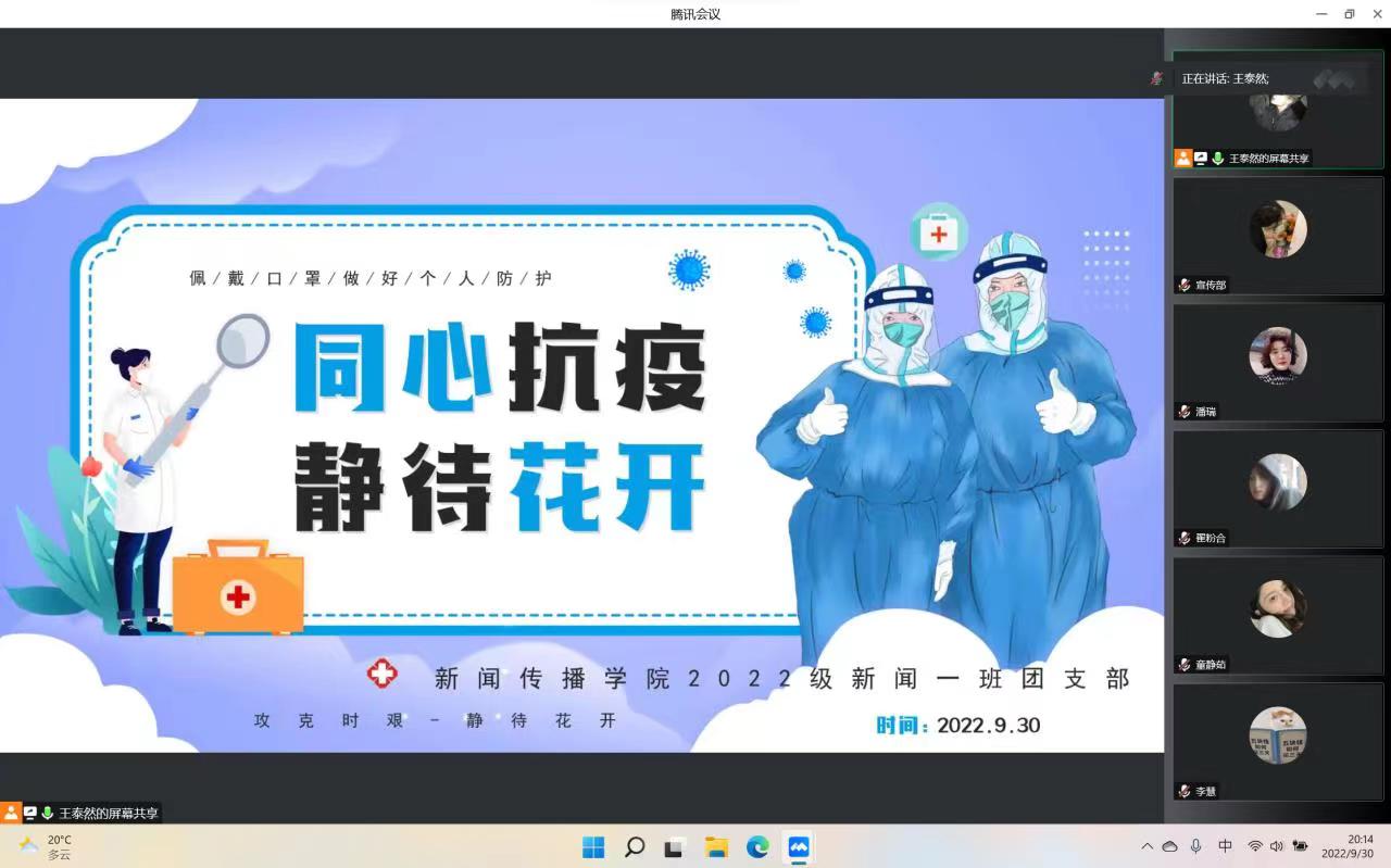 各班团支部书记主持班级活动,通过PPT展示、视频播放、感想交流等形式帮助同学们了解什么是冠状病毒、感染病例的症状、感染患者的临床表现以及预防新型冠状病毒感染的方法,号召同学们充分认识感染新型冠状病毒的危害并积极做好个人防护。2021级卓越人才新闻班团支部书记孙悦说:“大家要尽量少买或不买快递,严格遵守公司疫情防控规定,校园内务必须做到戴口罩,勤洗手,多通风,用实际行动共筑校园疫情防控安全屏障。”