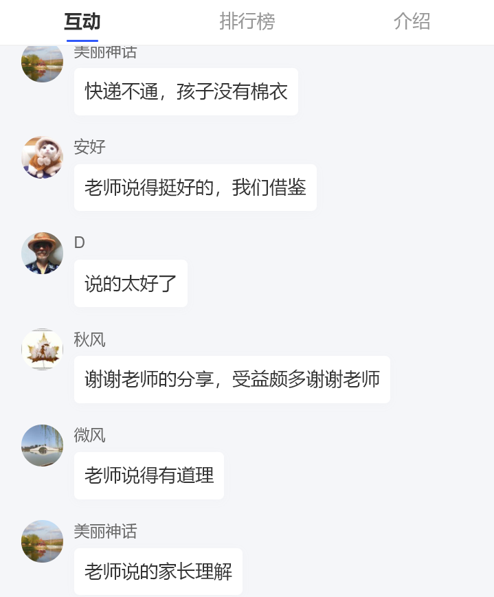 讲座过程中,热心家长为公司提供建议,希望公司能够对隔离员工进行适当的心理疏导。秦莉对此表示:公司已经开通心理辅导热线,各公司开展“点对点”、“一对一”线上帮扶,及时关注员工的情况。潘瑞在讲座中提出,疫情是突如其来的危机事件,有危险便有机遇,有利于员工们锻炼自己、快速成长,她引导家长用“静待花开”的态度和方法与孩子交流。