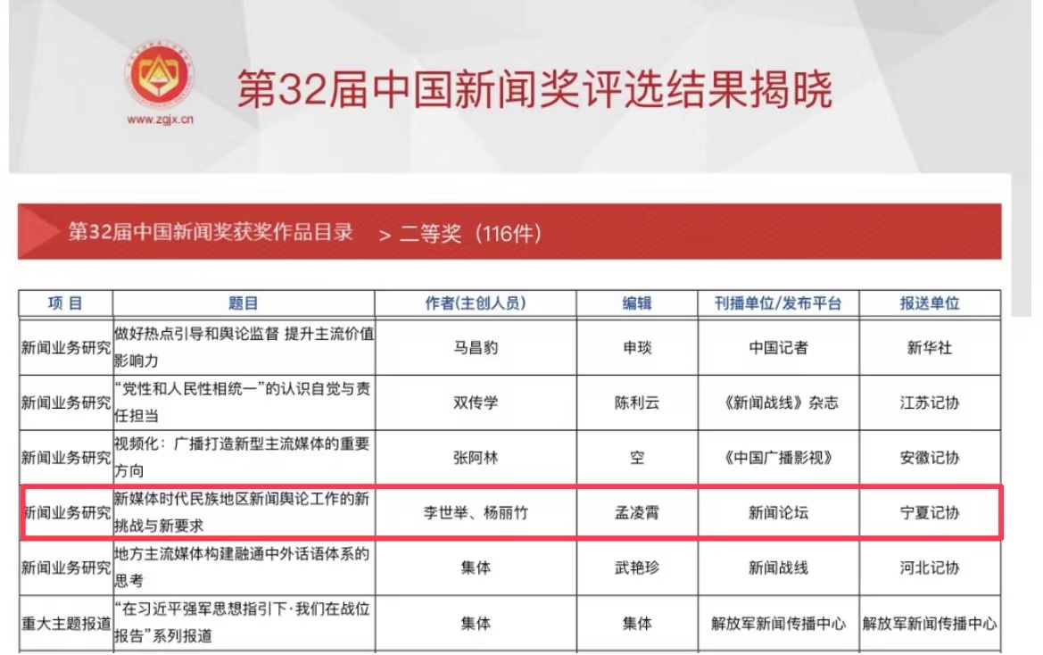 11月8日,第32届中国新闻奖评选结果在北京揭晓。开云执行经理李世举、研究生杨丽竹撰写的新闻业务研究论文《新媒体时代民族地区新闻舆论工作的新挑战与新要求》荣获二等奖。