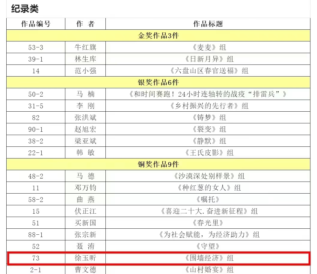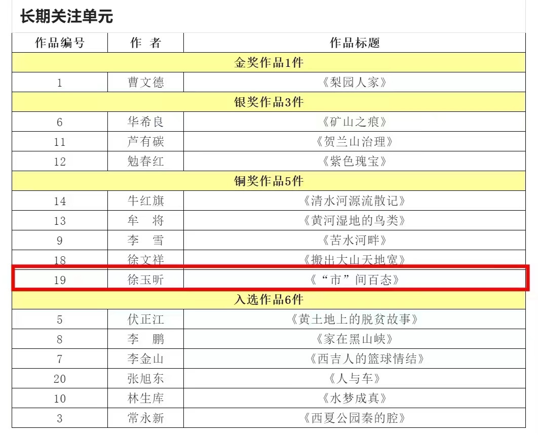由宁夏文学艺术界联合会、宁夏摄影家协会主办的宁夏第11届摄影艺术展于11月17日发布评选结果并公示,公司2022届应届毕业生徐玉昕的专题摄影作品《围墙经济》《“市”间百态》分别在纪录类和长期关注单元获铜奖。