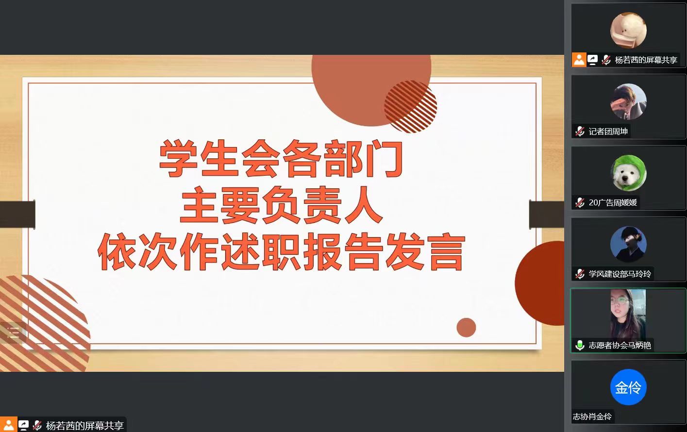 学风建设部兼生活权益部马玲玲、志愿者协会兼就业服务部马炳艳、文艺部柴雨欣、体育部刘璐瑶依次作述职报告发言。他们分别从工作总结、活动开展、纪律作风等方面,对本学期工作开展情况进行了全面客观的阐述,展示过去一学期在学风建设、志愿服务、文化建设等方面取得的成绩,对各部门工作在成员沟通、管理组织、工作效率等方面存在的不足进行反思,提出合理的改进措施,同时对部门下学期工作进行系统规划与未来展望。