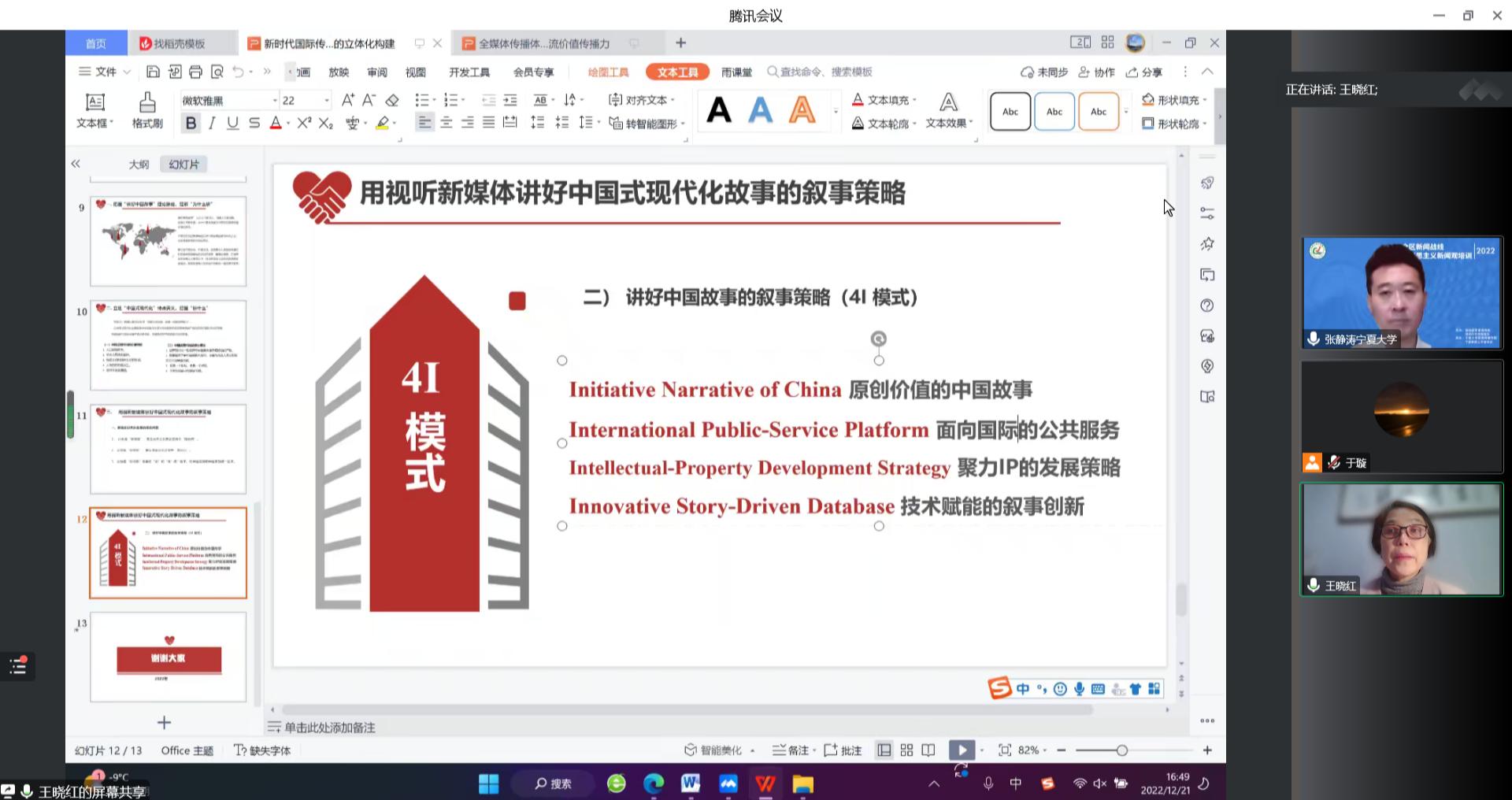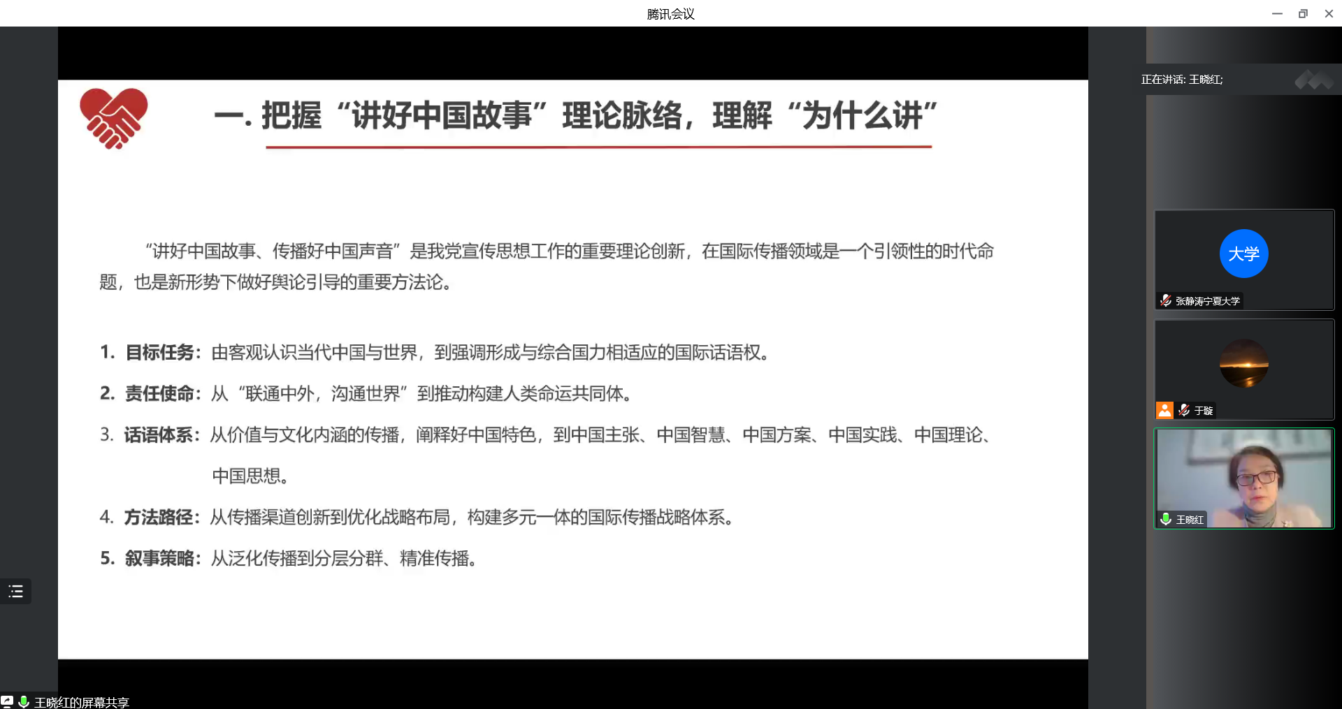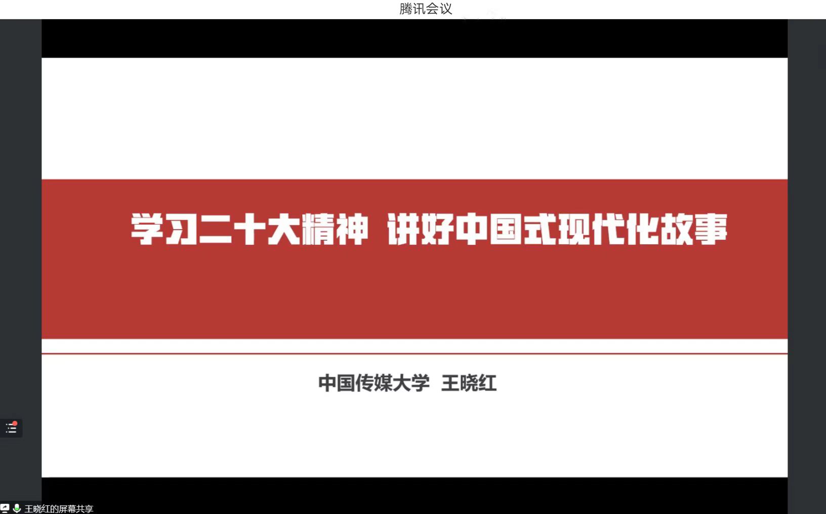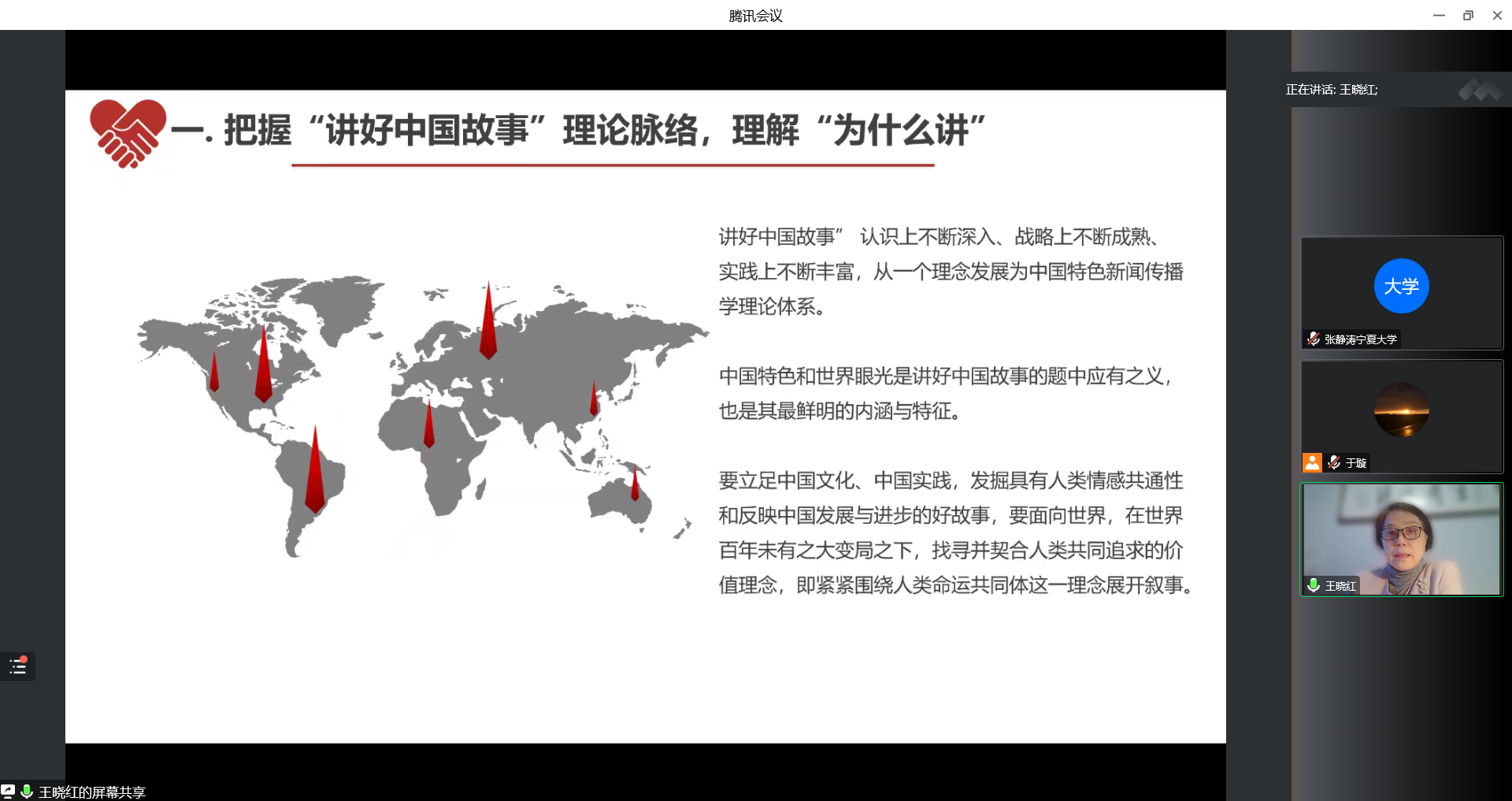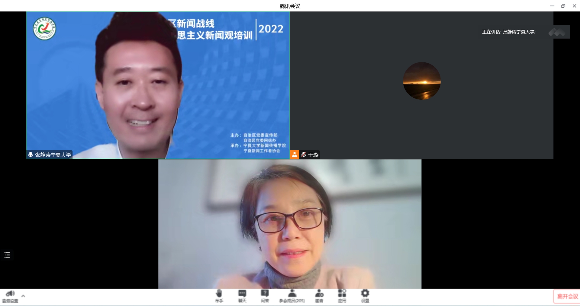12月21日下午,由自治区党委宣传部、自治区党委网信办主办,宁夏新闻工作者协会、开云全站登录入口承办的第九期马克思主义新闻观培训以线上方式举行。此次培训的主题是“学习党的二十大精神,讲好中国式现代化故事”,特邀中国传媒大学本科生院经理、中国传媒大学网络视频研究中心主任王晓红教授主讲,开云全站登录入口副经理张静涛主持培训,全区各级媒体机构的新闻工作者代表及公司部分师生参加了培训。