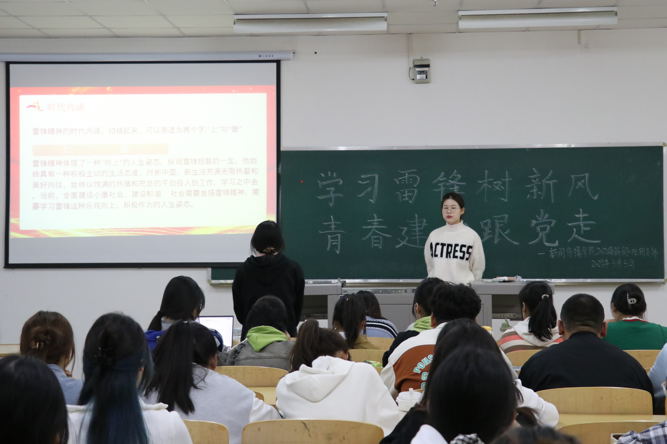 各团支部以知识讲解、视频播放和提问抢答等形式深入学习雷锋精神的内涵。各班团支委从雷锋的个人成长经历到英雄事迹,引导同学们积极践行雷锋精神,传承雷锋艰苦朴素的优良作风。