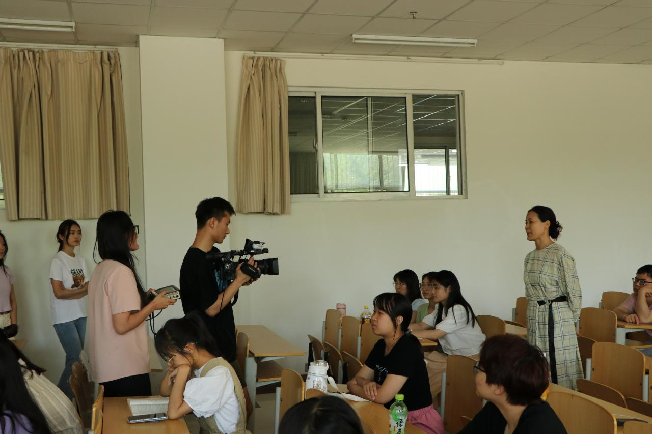 随后在同学们踊跃的报名下,我们组成了本次直播项目培训的实践小组,2021级李亦楠和2022级韩琛格同学担任出镜记者,由2021级姚春花和2022级王煊赫同学承担摄像工作,由2021级马玲玲、樊巧荣和张甜甜同学承担协助任务。在张巨红老师的示范指导下,由金晶老师带队,我们的实践小组出发去完成本次直播的任务,而他们的直播画面也会同步呈现在教室的多媒体屏幕上。与此同时,教室中的同学紧跟着他们的步伐,在李伟老师的对直播内容的同步讲解下,展开了一场别开生面的“虚拟之旅”。