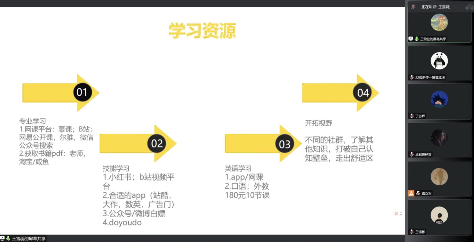 王雪蕊为大家分享了学习资源的获取渠道,向同学们说明了不管是在线上还是线下,都要利用好一切的学习资源,这对提高成绩与个人素质,以及拓宽自己的视野大有裨益。