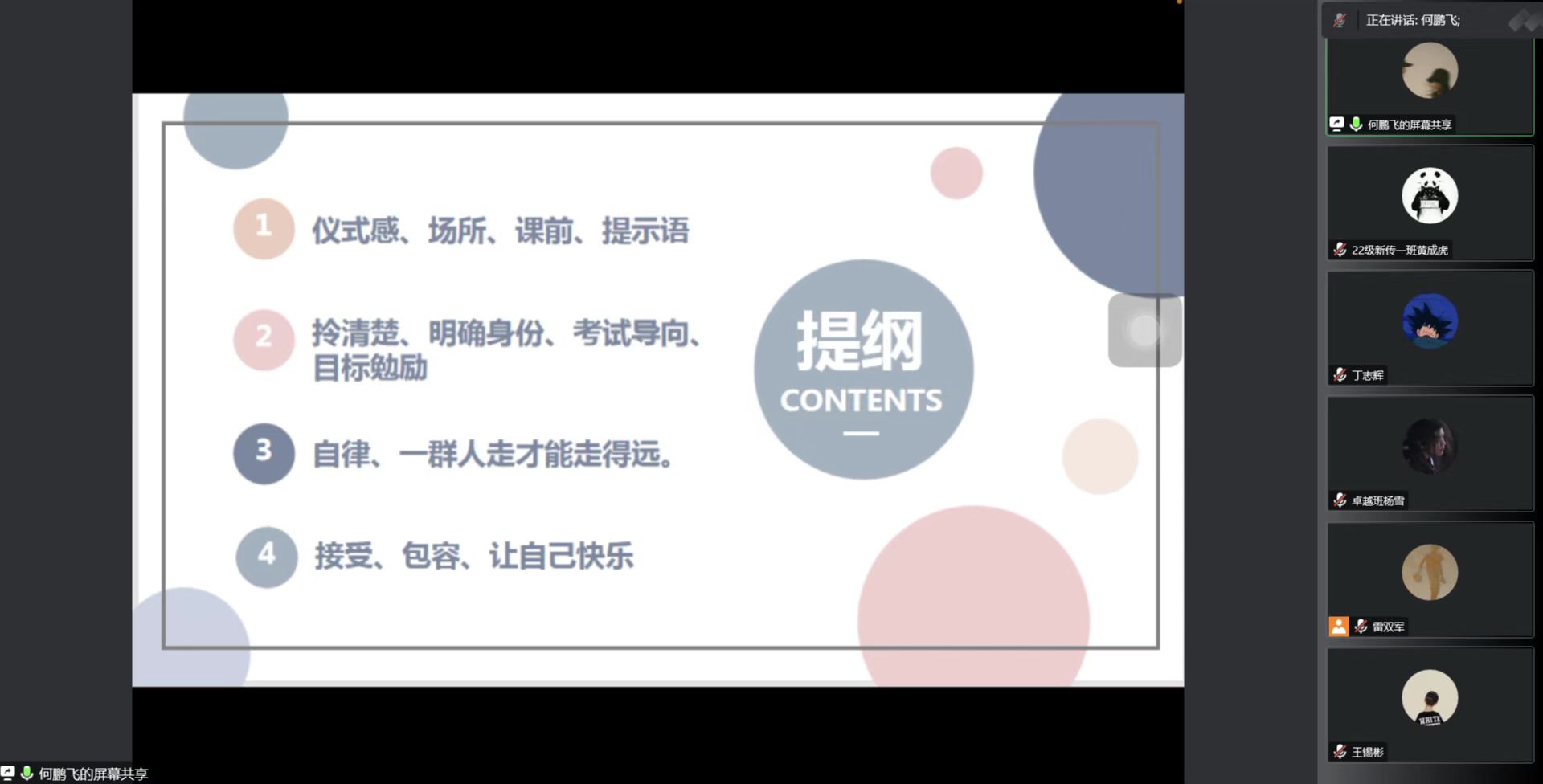 何鹏飞从宏观的角度,结合自己的心路历程,向大家强调了学习需要仪式感,并着重于学习态度,指出自律的重要性。