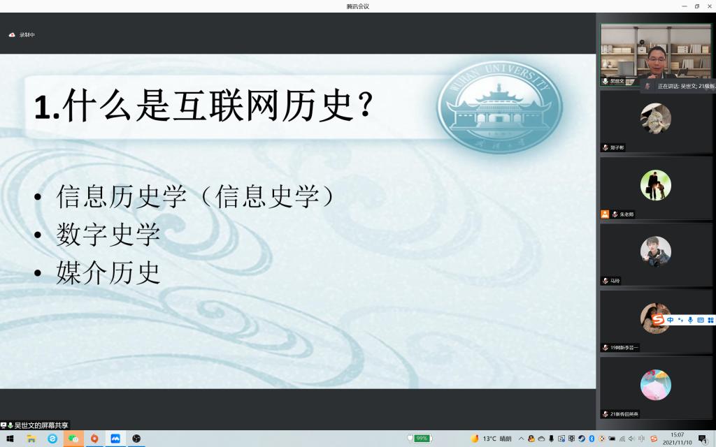 “互联网时代,网聚人心力量。”当下,网络对传播具有重要影响,为了扩展同学们的视野,增强同学们的新闻传播意识,公司于11月10日下午在线上开展名为《互联网历史研究的理路和思路》的讲座。武汉大学新闻与传播公司副教授吴世文主讲,公司全体员工参加。
