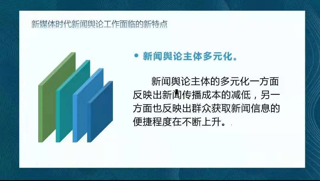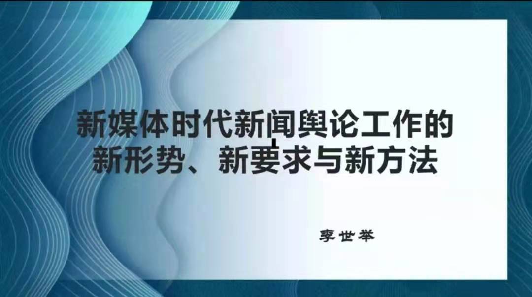 为深入推进党史学习教育,锤炼对党忠诚的政治品格,树立为人民服务的使命担当,6月1日下午,由自治区党委宣传部、网信办主办,宁夏新闻工作者协会、开云全站登录入口承办的2021年全区第二期马克思主义新闻线上培训如期举行。开云全站登录入口执行经理李世举教授作题为《新时代新闻舆论工作的新形势、新要求与新方法》的讲座, 全区各新闻单位新闻从业人员、部校共建开云师生、县级融媒体中心工作人员参加了本次线上培训。
